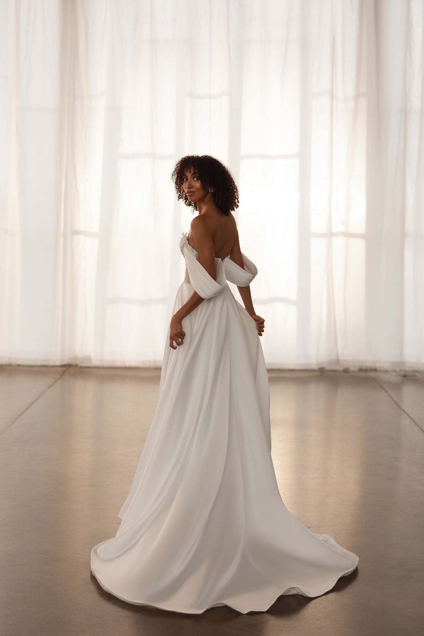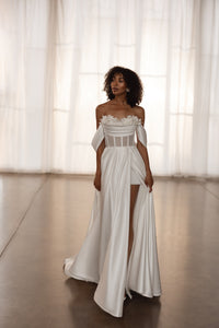 The Desi satin A-line wedding dress is a stunning blend of elegance and romantic detail, designed for the modern bride who loves timeless sophistication. Crafted from luxurious satin, this gown features a flattering A-line silhouette that flows effortlessly with every step. A daring slit adds a touch of allure, while the structured corset bodice provides support and shape, beautifully accentuating the waist. Delicate floral appliqué details cascade across the bodice, adding a soft, feminine charm that elevates the entire look. Perfect for brides seeking a graceful yet bold statement on their special day.