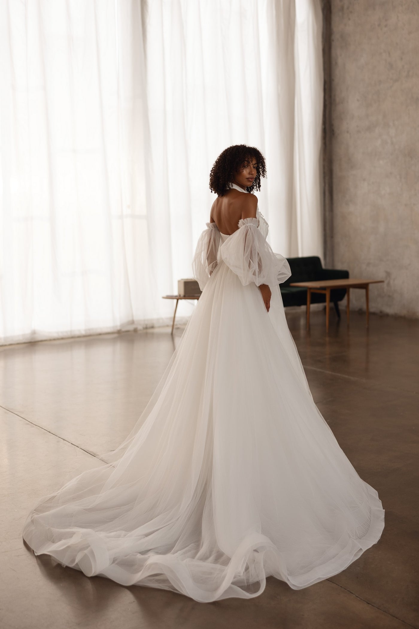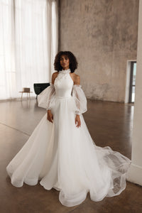 Featuring a sleek silhouette that hugs your curves, Rosa comes with detachable sleeves and a removable overskirt, giving you a flawless 2-in-1 look — from ceremony sophistication to reception-ready glam.