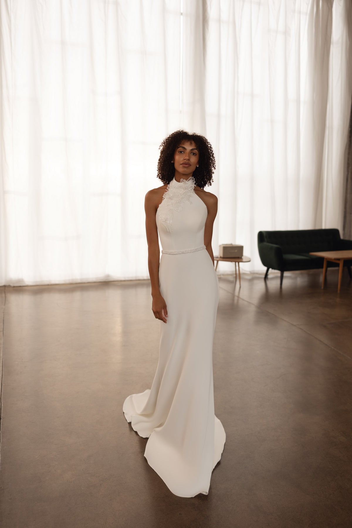 The Rosa Dress is a stunning fitted halter-neck gown designed for brides who love a dramatic reveal.